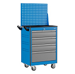 4 ящика и перфорированный экран. Нагрузка на тележку 220кг. Корпус тележки сварной. Тележка оснащена системой антиопрокидывания новой конструкции, которая блокирует открывание ящиков. На боковых стенках корпуса выполнена квадратная перфорация для установки крючков, держателей и других аксессуаров. Ящики на шариковых телескопических направляющих полного выдвижения. Обеспечен свободный и плавный ход ящиков даже при полной загрузке. Габаритные размеры тележки с учетом колес, лотка и ручки (ВхШхГ), не более: 808х780х490  мм. Вес: 45,4