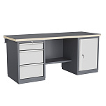 Двухтумбовый. Допустимая нагрузка на столешницу 1000 кг. Опорные элементы выполнены сварными из холоднокатаной стали. Для выполнения сборочных, ремонтных, слесарных, монтажных и других видов работ на производстве, в сервисных центрах, мастерских, гаражах, а также для обучения технологии в учебных заведениях. Комплектуется полкой-стенкой, расположенной под столешницей для удобного размещения габаритного инструмента и оснастки. Размеры верстака: 855x1796x696 мм. Вес: 133 кг. Поставляется в 4 комплектациях на выбор.