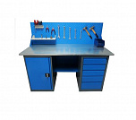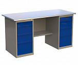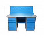 Двухтумбовый. Допустимая нагрузка на столешницу 1000 кг. Опорные элементы выполнены сварными из холоднокатаной стали. Для выполнения сборочных, ремонтных, слесарных, монтажных и других видов работ на производстве, в сервисных центрах, мастерских, гаражах, а также для обучения технологии в учебных заведениях. Комплектуется полкой-стенкой, расположенной под столешницей для удобного размещения габаритного инструмента и оснастки. Размеры верстака: 855x1596x696 мм. Вес: 123 кг. Поставляется в 4 комплектациях на выбор.