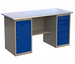 Двухтумбовый. Допустимая нагрузка на столешницу 1000 кг. Опорные элементы выполнены сварными из холоднокатаной стали. Для выполнения сборочных, ремонтных, слесарных, монтажных и других видов работ на производстве, в сервисных центрах, мастерских, гаражах, а также для обучения технологии в учебных заведениях. Комплектуется полкой-стенкой, расположенной под столешницей для удобного размещения габаритного инструмента и оснастки. Размеры верстака: 855x1596x696 мм. Вес: 127 кг. Поставляется в 4 комплектациях на выбор.
