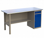 Однотумбовый. Допустимая нагрузка на столешницу 750 кг. Опорные элементы выполнены сварными из холоднокатаной стали. Верстак состоит из столешницы, опоры, тумбы P3 с тремя большими ящиками, полки-стенки и одинарного экрана с кронштейнами. Все металлические элементы покрыты полиэфирной порошковой краской. Столешница состоит из фанеры марки ФСФ толщиной 24 мм, которая покрыта лаком-антисептиком и листом оцинкованной холоднокатаной стали толщиной 1,2 мм. Размеры (ВхШхГ) 1470x1196x696 мм.