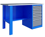 Однотумбовый. Допустимая нагрузка на столешницу 750 кг. Опорные элементы выполнены сварными из холоднокатаной стали. Верстак состоит из столешницы, опоры, тумбы P5 с четырьмя малыми и одним большим ящиком и полки-стенки. Все металлические элементы покрыты полиэфирной порошковой краской. Столешница состоит из фанеры марки ФСФ толщиной 24 мм, которая покрыта лаком-антисептиком и листом оцинкованной холоднокатаной стали толщиной 1,2 мм. Размеры (ВхШхГ) 855x1396x696 мм.