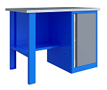 Однотумбовый. Допустимая нагрузка на столешницу 750 кг. Опорные элементы выполнены сварными из холоднокатаной стали. Верстак состоит из столешницы, опоры, тумбы P7 с дверью, полки-стенки и одинарного экрана с кронштейнами. Все металлические элементы покрыты полиэфирной порошковой краской. Столешница состоит из фанеры марки ФСФ толщиной 24 мм, которая покрыта лаком-антисептиком и листом оцинкованной холоднокатаной стали толщиной 1,2 мм. Размеры (ВхШхГ) 1470x1196x696 мм.