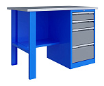 Верстак однотумбовый поставляется в разобранном виде. Нагрузка на столешницу до 600 кг. Стандартный цвет: корпус - серый глянец RAL 7030, ящики и двери тумб - синий RAL 5017. Размеры:855x1400x700 мм. Вес: 76 кг.