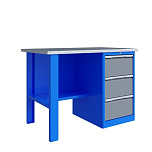 Однотумбовый. Допустимая нагрузка на столешницу 750 кг. Опорные элементы выполнены сварными из холоднокатаной стали. Верстак состоит из столешницы, опоры, тумбы P3 с тремя большими ящиками, полки-стенки и одинарного экрана с кронштейнами. Все металлические элементы покрыты полиэфирной порошковой краской. Столешница состоит из фанеры марки ФСФ толщиной 24 мм, которая покрыта лаком-антисептиком и листом оцинкованной холоднокатаной стали толщиной 1,2 мм. Размеры (ВхШхГ) 1470x1196x696 мм.