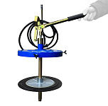 Солидолонагнетатель ручной, для бочек 20-60 кг, для густой смазки. Комплект оснащен тележкой для бочек 20-60 кг., насос для смазки ручной производительностью 300 гр/мин, мембрана и крышка для солидолонагнетателя, шланг 4 м, раздаточный пистолет с наконечником. При давлении воздуха 6-8 Атм давление смазки 400 Атм максимально. Колёса: 2 прямых. Масса: 12 кг.