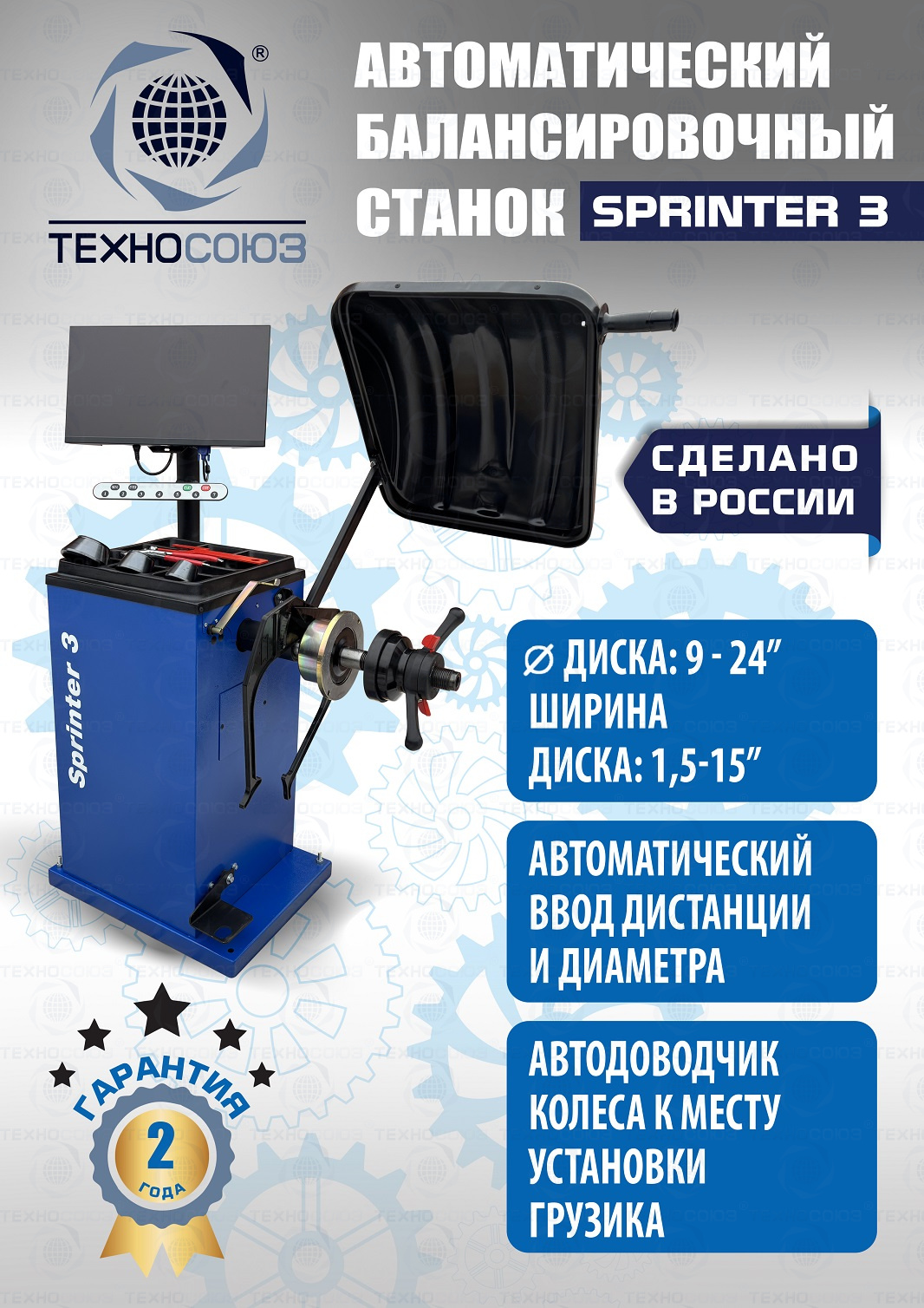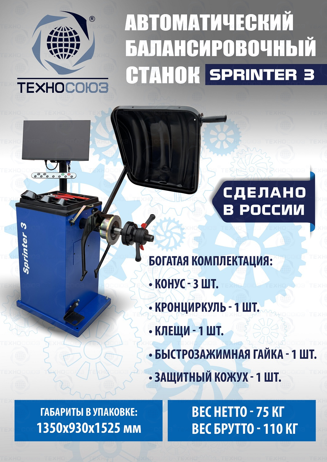 ПРОИЗВОДСТВО РФ. Автомат. LCD Монитор с понятным управлением. Автоматический и прямой ввод всех параметров для колес с алюминиевыми дисками. Автоматический доводчик. Автоматическое закручивание гайки. Электронная линейка. Многофункциональная педаль управления станком для возможности работы без нажатия кнопок. Статистика и учет расхода грузиков. Вал 40 мм шлифованный. Для колёс легковых авто и коммерческого транспорта с диаметром диска с резиной до 850 мм. Размеры диска: ширина 1–15” , диаметр диска 9–24”. Вес колеса 65 кг. Гарантия 2 года.