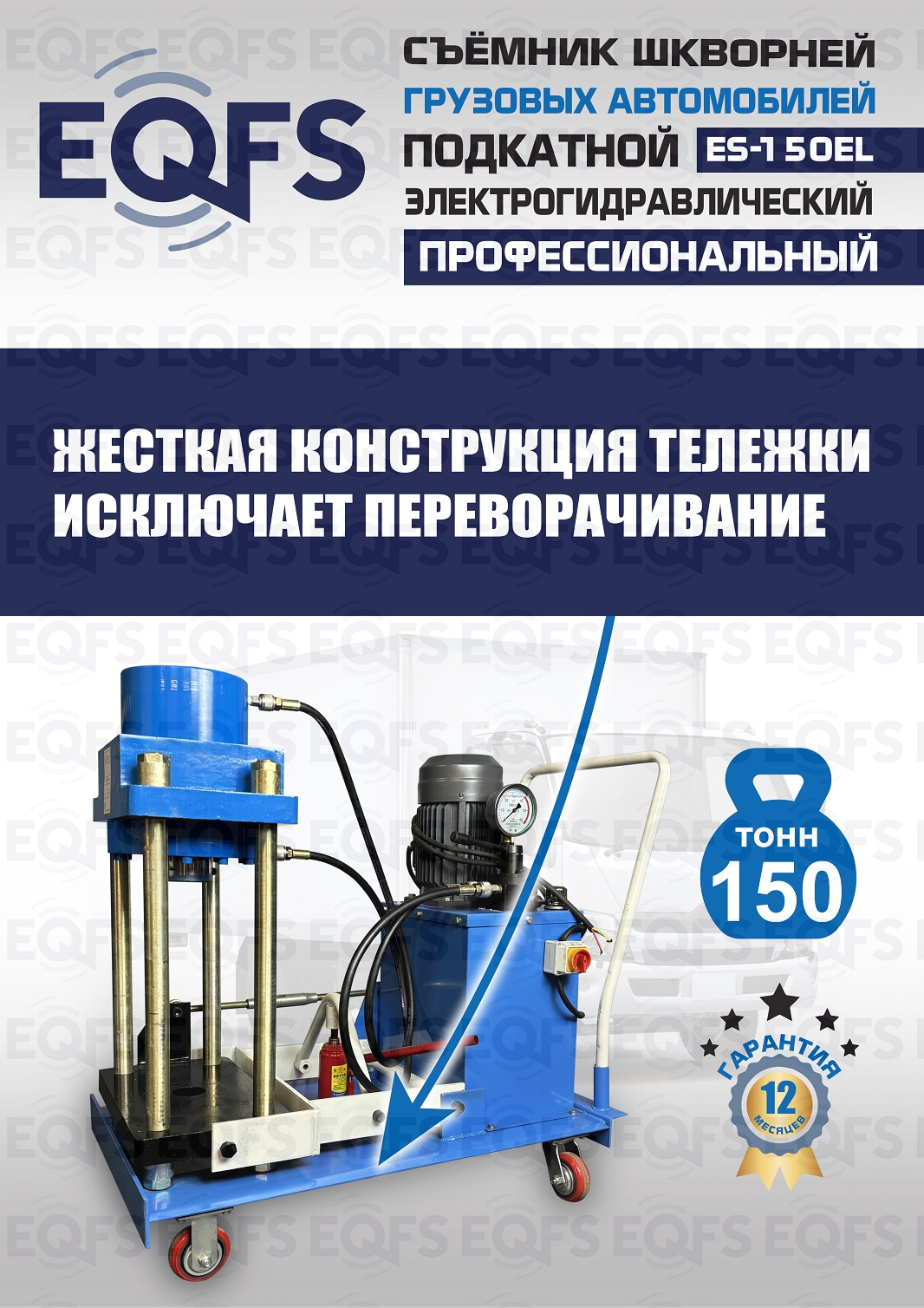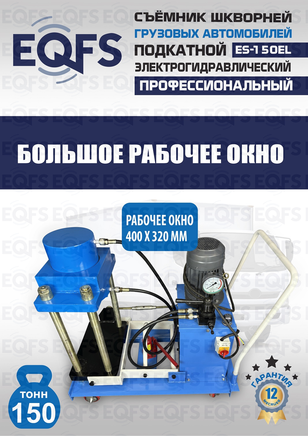 Сокращает время ремонта. Позволяет работать под разными углами 1 человеку. Мобильный. Для выпрессовки шкворней из поворотной цапфы погрузчиков, тракторов, строительной техники, коммерческих и грузовых авто отечественного и импортного производства: MAN, MERCEDES, SCANIA, VOLVO, Корейские и Китайские авто. Электрогидравлический привод. Рабочее окно 400x320 мм. Усилие 150 тонн.