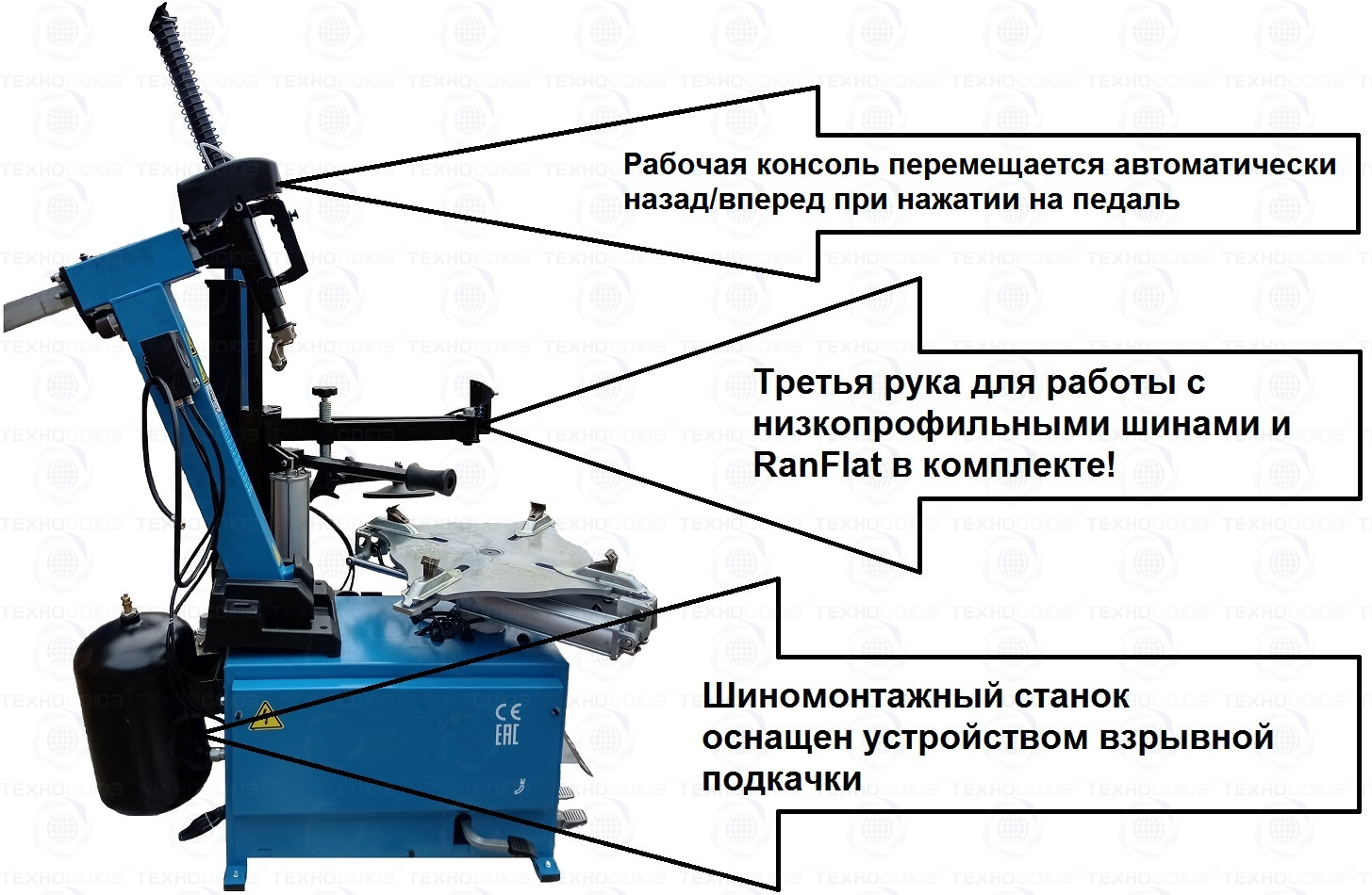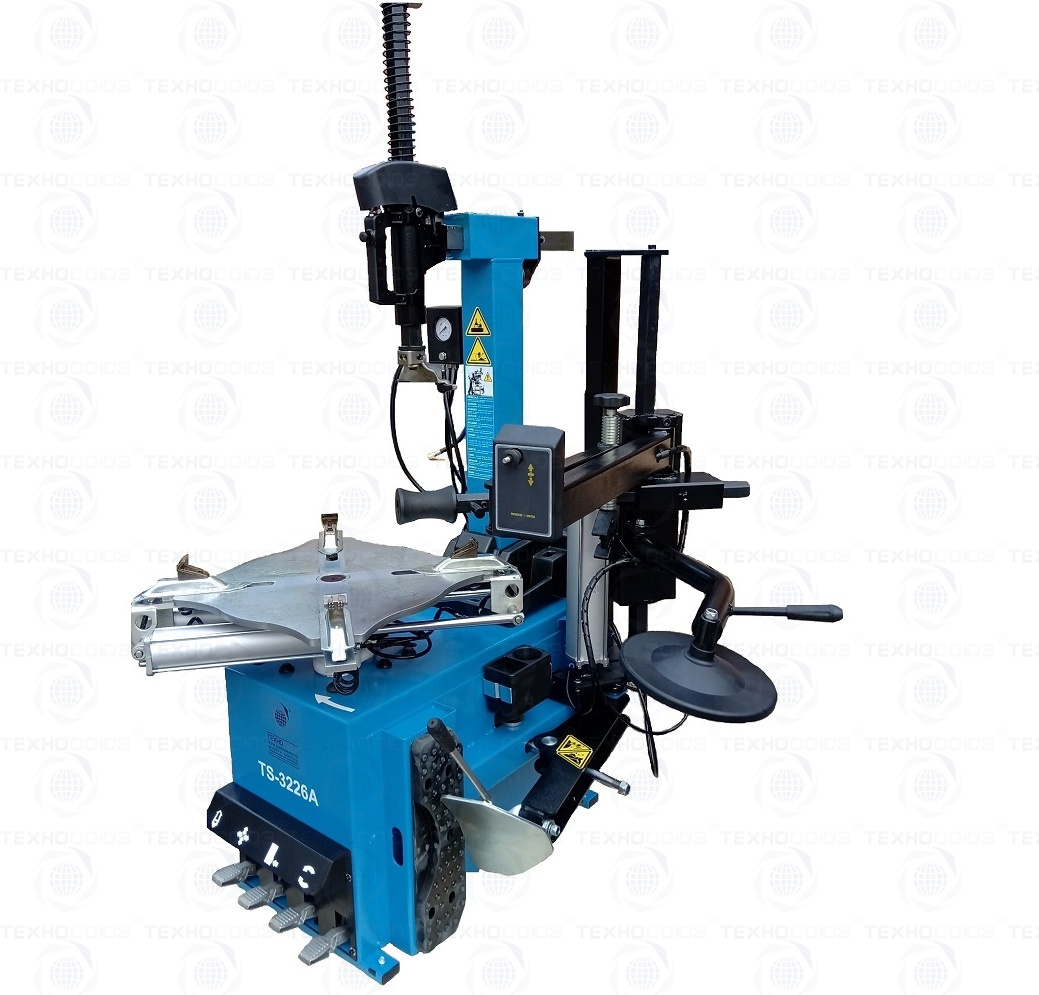 автоматического шиномонтажного стенда TS-3226А. Предназначен для монтажа и демонтажа шин легковых автомобилей, внедорожников и легких грузовиков с размером колес от 11-24 дюйма. Усилие пневмоцилиндра в 2500 кг. В комплекте: полноценная 3-й рука для работы с жесткой и низкопрофильной резиной RUNFLAT. + встроенный бустер 24 литра (взрывная подкачка) + пистолет для подкачки шин + монтажка + регулятор давления с влагоотделителем и манометром.