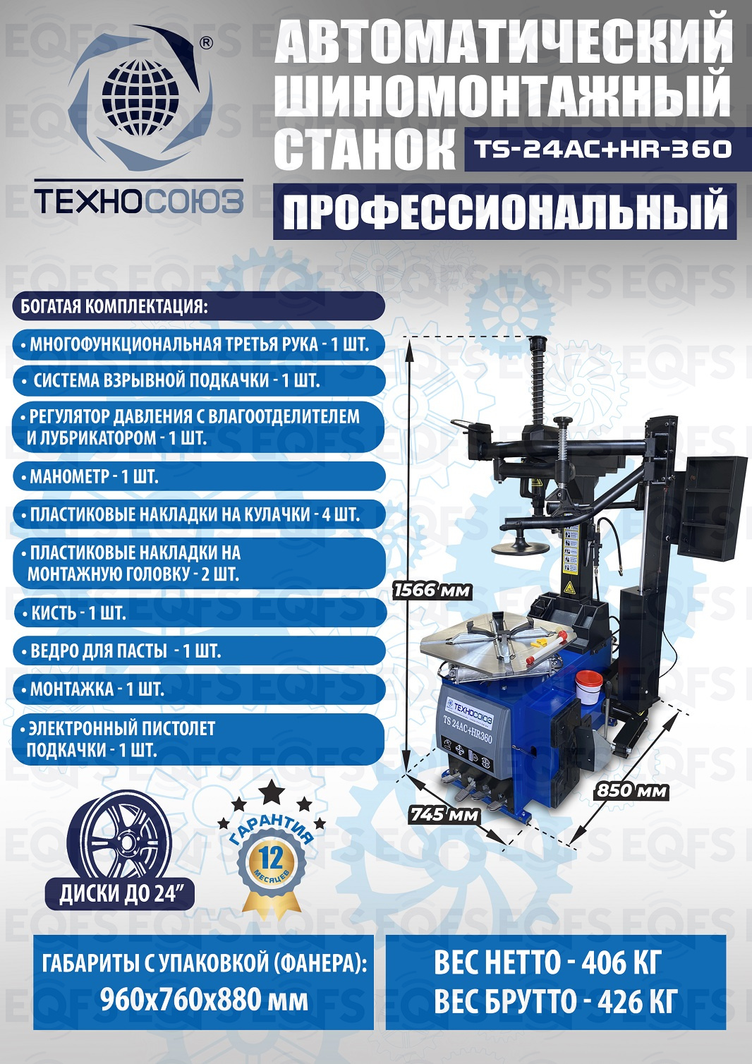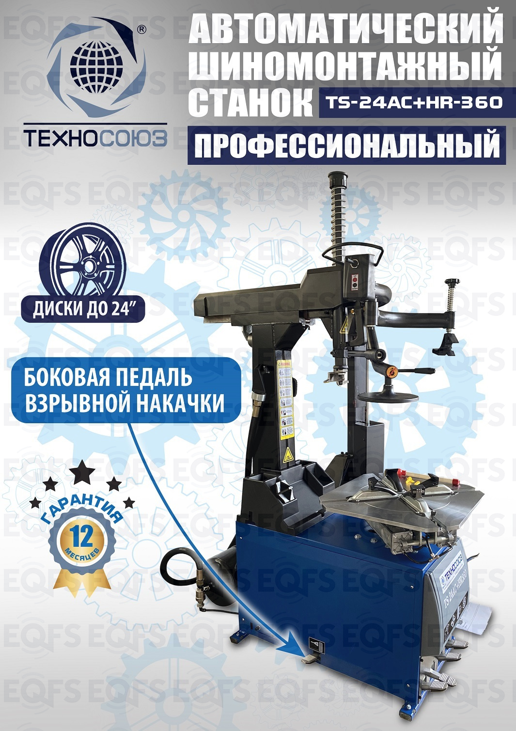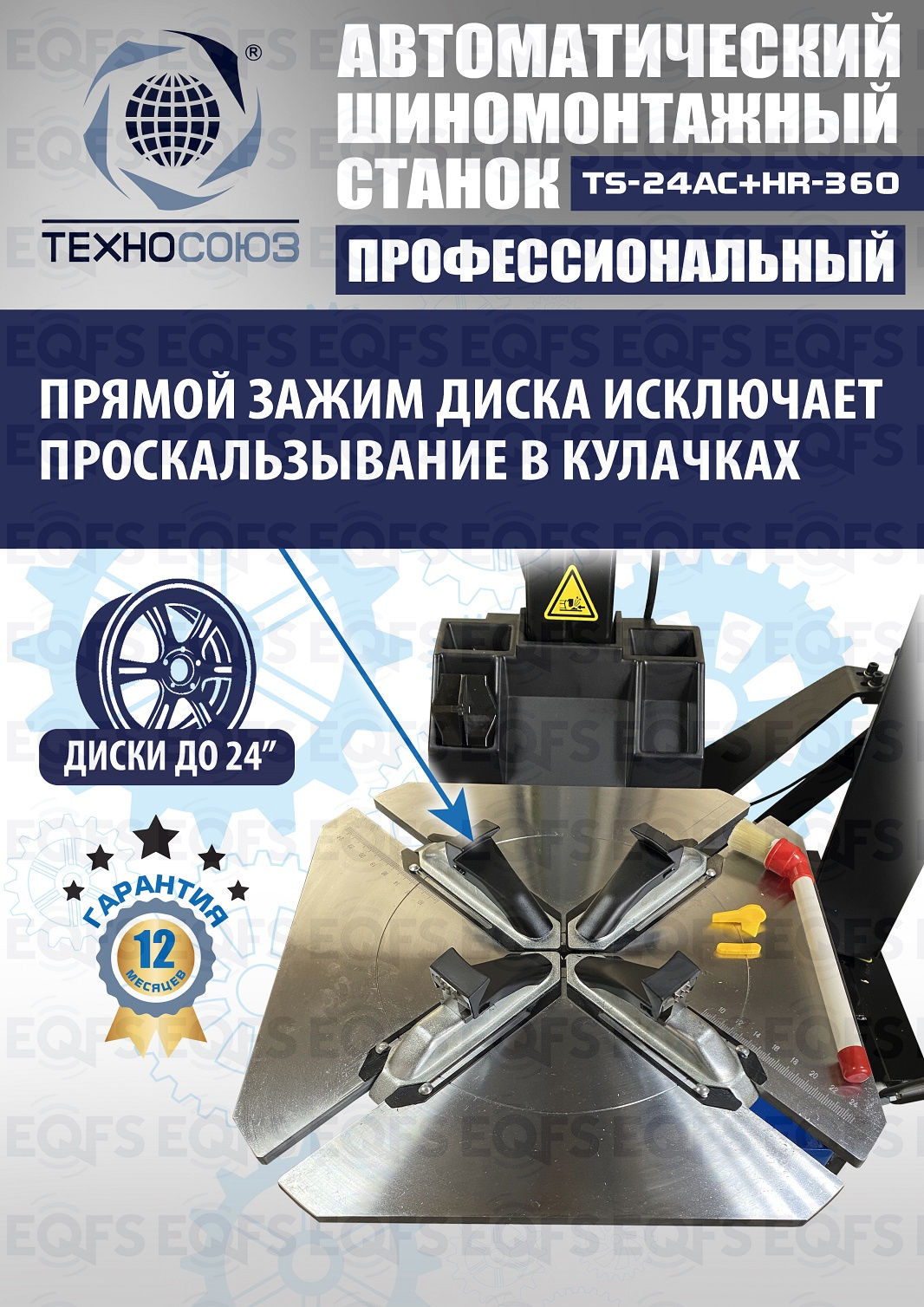 Автоматического шиномонтажного стенда TS-24AC+HR-360. В комплекте взрывная подкачка + третья рука для работы с низкопрофильными шинами и RanFlat! Для колес легковых автомобилей, легких грузовиков, микроавтобусов и коммерческой техники. Для дисков: внешний 10÷21”, внутренний 12÷24”. Напряжение 220/380В. Гарантия 18 мес. – наш монтаж, 12 мес. – самостоятельная установка.