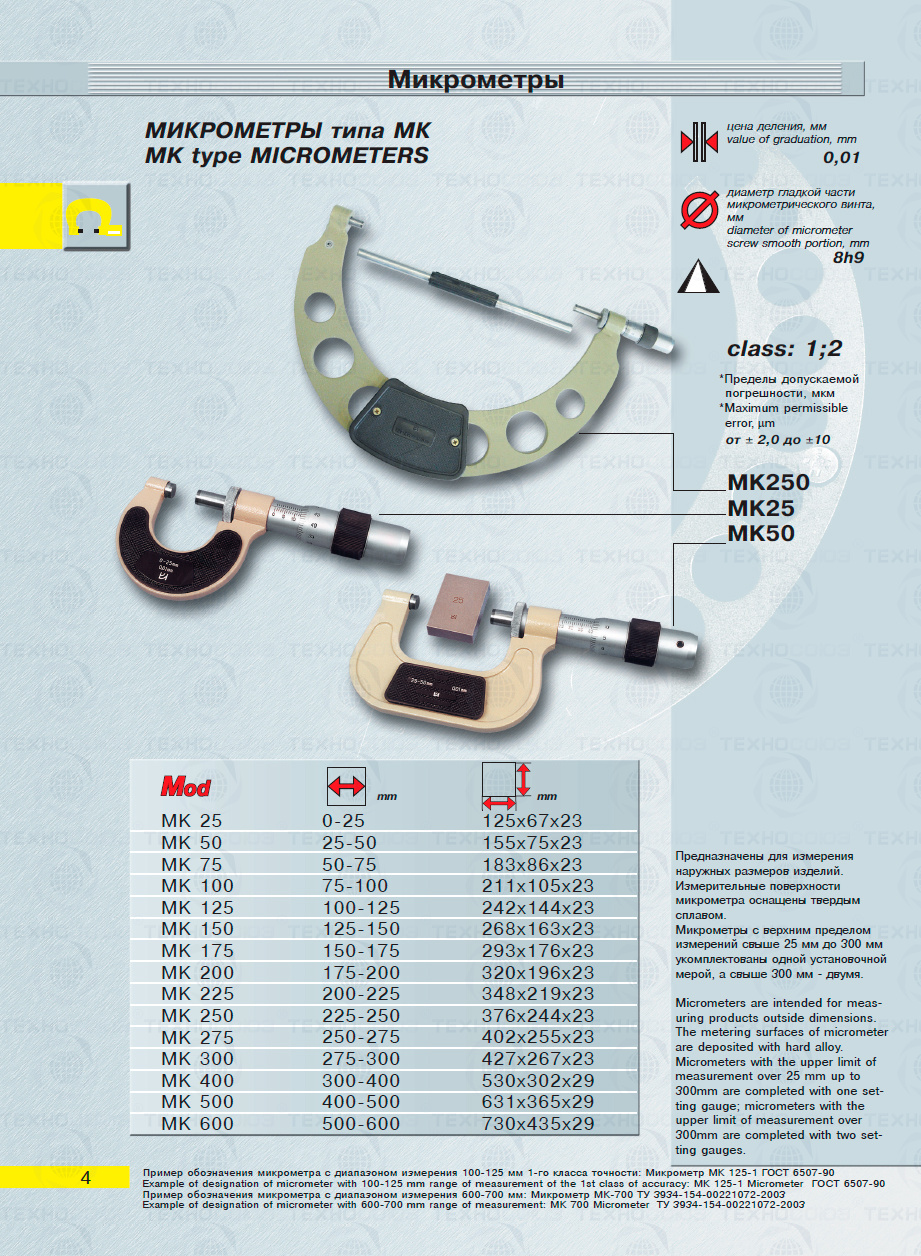 Цена деления 0,01 мм. Диапазон измерения от 200-225 мм. Для измерения наружных размеров изделий. Измерительные поверхности микрометра оснащены твердым сплавом. Микрометры укомплектованы одной установочной мерой. Класса точности 1. ГОСТ 6507-90. Поставляется в двух вариантах с поверкой и без поверки!