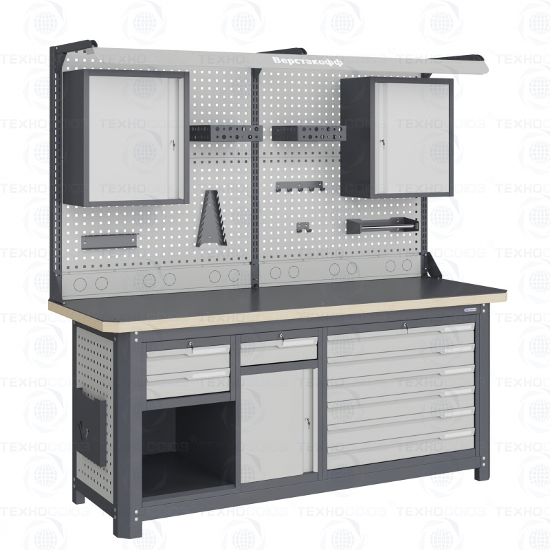 Нагрузка на столешницу 1500 кг. Столешница из листа влагостойкой фанеры марки ФСФ толщиной 40 мм листом горячекатаной стали толщиной 5 мм. Рама верстака выполнена их холоднокатаной стали. Модуль верстака выполнен сварными. Ящики в модулях устанавливаются на шариковых телескопических направляющих полного выдвижения. Квадратная перфорация для установки крючков, держателей. Размеры: 1982x1993x743 мм.