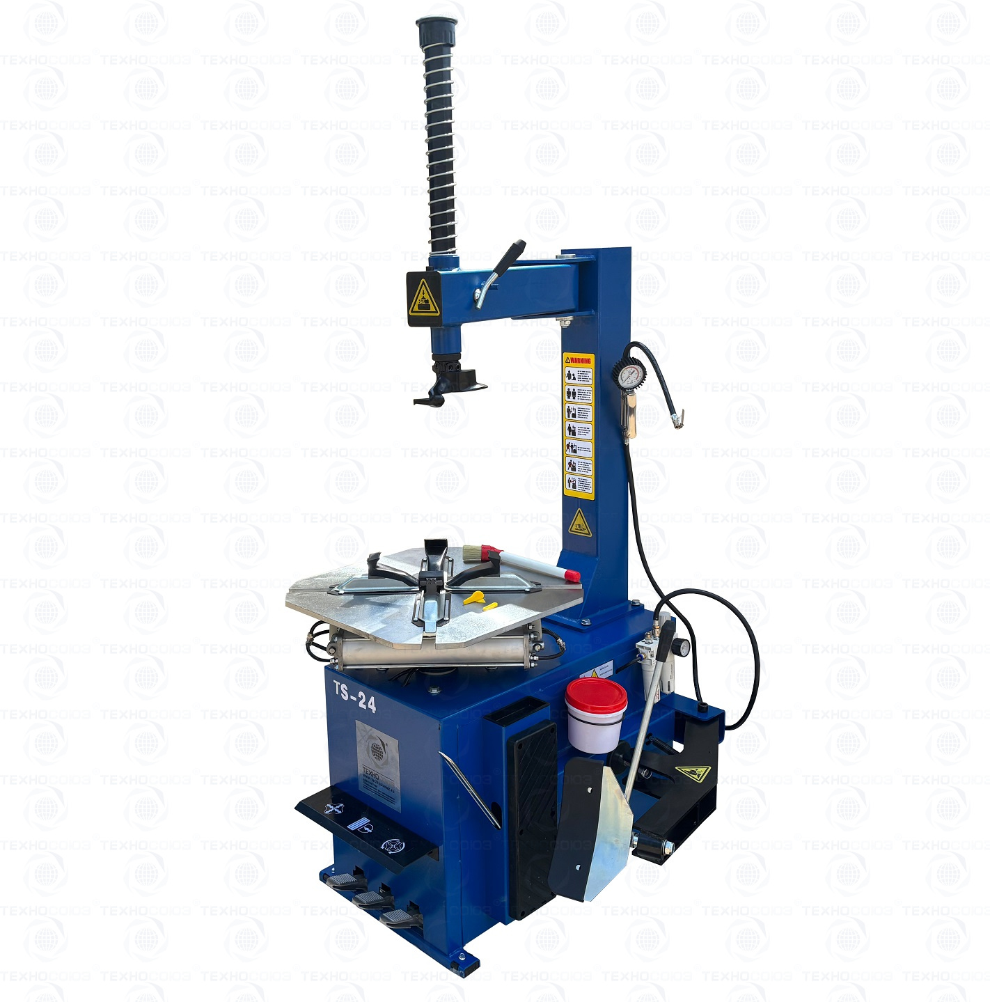 шиномонтажного станка TS-24. Полуавтоматический. Квадратный стол. Для дисков:11÷24”. Усилие отрыва покрышки 2700 кг. В комплекте: пистолет с манометром для подкачки шин + монтажка + пластиковые накладки на зажимные кулачки + регулятор давления с влагоотделителем и манометром